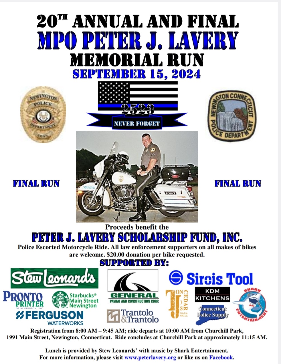 The 20th annual and FINAL Master Police Officer Peter J. Lavery Memorial Ride will take place on September 15th, 2024.  See the attached flyer for additional details.